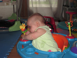 Pretty quickly Ali got distracted by the toys on her chair, and Sammy followed suit. We decided to wrap things up and let the girls get back to playing. I am pleased with the first attempt! They got a chance to manipulate food and practice bringing it to their mouths. Actually eating it will come in time. We are going slow right now. I think the girls need a little more practice sitting up. They both also seem very happy with just nursing. It is nice not to have to rush the solids. We give them a chance to eat like this every other day or so . Our grocery bill appreciates them taking their time getting into solid food.