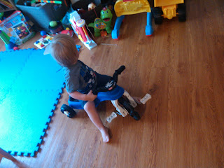 It is currently sitting in our living room, which won’t last for too long. I am a big believer in outdoor toys being outdoors. He mainly likes to push it around, so I don’t mind too much right now. He does like to sit on it, and it working on figuring out the pedals! I’m sure he’ll pick up on it quick, then watch out! I don’t think I’ll be able to keep up with him!