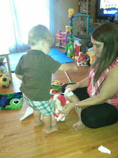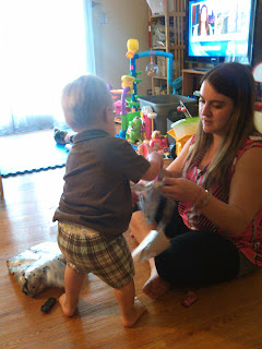 Last couple of things. The Mickey balloon is still alive and well. It is about as big as Ben is. He adores it. He hugs it, tries to feed it, just in general thinks it’s the best thing ever. Dagger, on the other hand, abhors the balloon. She is seriously terrified of it. She will not come downstairs while it is out. We have to close it in the bathroom when Ben is asleep or we aren’t home so she will come downstairs. It’s actually kind of funny.