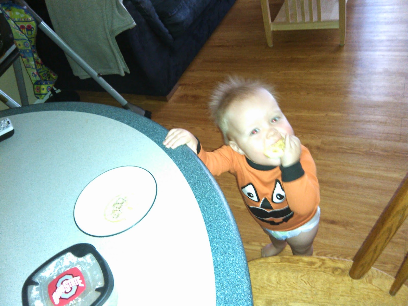 Someone is getting taller. Ben never used to be able to reach up onto the kitchen table. He could grab the edge, but not actually get anything on the table. One morning this week I started getting Ben’s breakfast together. I put the plate with the egg patties on the table, and then I went back to the kitchen to get the oatmeal and our water. I came back to find this. Ben had reached up onto the table, nabbed his egg patty off the plate, and started chowing down. I guess I was too slow on breakfast. Time to start keeping things away from the edge of the table. 🙂