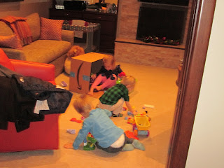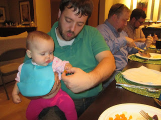 We did learn a few things on this outing. We didn’t bring any high chairs or anything for the girls. When Ben was this age we would just hold him if we were out without a high chair. I thought maybe we could do the same with the girls. Yeah…. doing that with twins is a little harder. I forgot that part of what worked was that we took turns feeding Ben and eating ourselves. Both girls needing to eat took a lot of attention. We actually ended up having them sit on the floor with a bowl of cheerios after they had eaten their other food. We brought the high chairs after that. Oh well, they didn’t seem to mind. We also learned that Sammy really likes prime rib. (I hope she doesn’t think that will be a common meal, these kids eat a lot!:) )