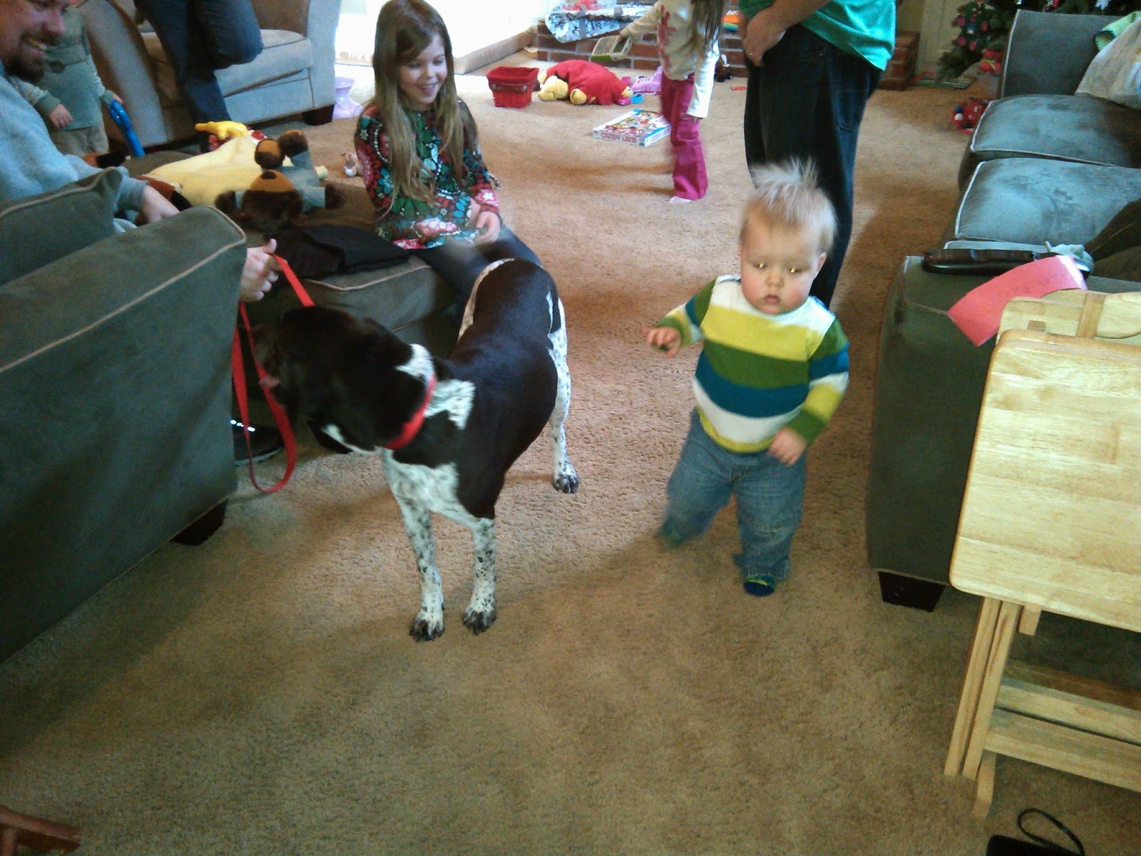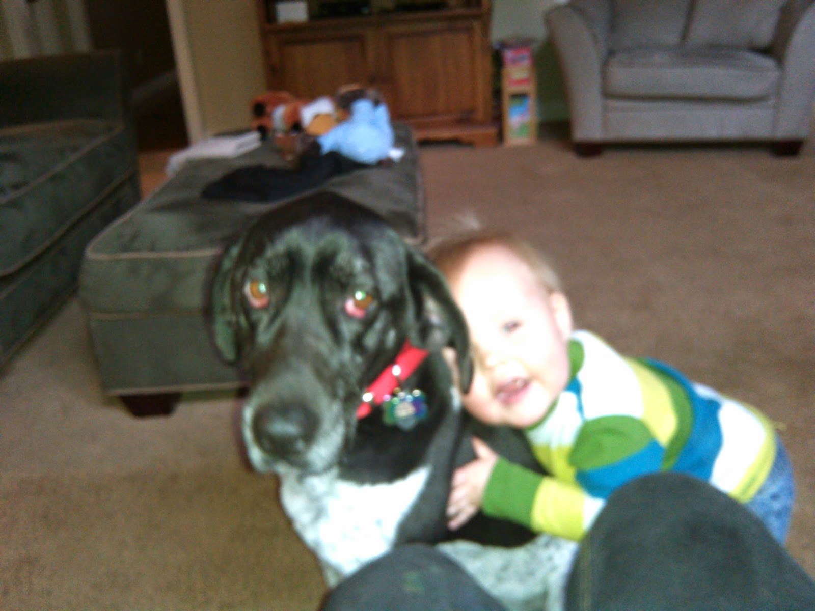 I loved watching Ben with LadyBird. He loved to go up to her and hug and kiss her, but only as long as she was looking the other way. Understandably he didn’t like the get a big wet nose to the face! If she came up to him he tended to curl into a ball or grab onto whomever was closest to him. Charlotte was particularly helpful at making sure LadyBird didn’t ‘get’ him. Pat and I were not super helpful, as we got a little kick out of LadyBird drooling on him. Revenge for all the drool bombs he drops on us! LadyBird was wonderful with Ben, as she is with all the kids. She didn’t mind at all when Ben used her to pull up to standing, or when he was a little less than gentle with the petting. She also didn’t mind when he crawled up on her bed to give her a kiss and a pet.