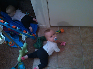 These girls are just the best. Oh, they can be a handful sometimes. They get into everything! Seriously, I don’t remember Ben getting into as much as a baby. Maybe it seems that way because I had just one kid so I could prevent more from happening? Or perhaps because Ben didn’t crawl until he was almost a year old, so he didn’t have the opportunity to get into things before he knew better. Ali and Sammy are smart and learning. They know what they are not allowed to do. They are starting to leave the outlets alone thank goodness! They love to get into the toys. They are, well, sometimes kind of jerks to each other. They are constantly stealing toys from each other. They pull pacifiers out of each others’ mouths. Sometimes to put into their own mouth, sometimes just to have two. They love to crawl around and explore. They pull up to kneeling to try to see everything. They already think it is super fun to try to get into their brother’s room. Luckily Ben doesn’t mind right now, but he will. 😉 The girls have learned if they pull up to kneel by the couch they can reach Ben while he sits. This is a super fun game for the girls. Ben does not seem as impressed with it. So far he handles it well, just scooting out of the way. He is going to have to adjust to a lot of love once Ali and Sammy figure out how to get on the couch too. Both girls crawl all over each other and wrestle around a bit. It sounds like they are fighting, but when I say anything to them they just look up and smile. Silly babies. Sammy is more likely to be on top. She tends to take direct routes to where she is going. Ali takes the time to go around and find the best path that way. Sammy is still happier to play on her own. She loves to use her feet to hold one toy while she plays with another. Ali likes to pull toys and books off shelves. She has been very happy to play on her own now that she can kneel at things. Both girls have been obsessed with the baby keys we have. We do have two sets, but of course they want the one their sister has. (Oh, and that usually means Ben wants them too.) They love the kids nativity we have out for them to play with. They are into rings and balls too. They have created a new game for themselves. We have a tiny area by the front door that is tile, and the balls from the ball factory bounce and roll really well on it. They crowd into this space and knock the balls around in a little hockey game of some sort and just laugh. Pat has been warned to open the front door slowly when he gets home. Of course the best time to play this game is when someone needs to use the door.