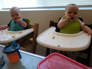 The girls are pretty good eaters. They’ve had some more teeth coming in, and that makes them picky about what they eat. Ali likes softer foods while Sammy prefers hard things to grind into her gums. Overall I think they are doing pretty well. Both of them can drink from a straw now! This is awesome because it means they can drink the smoothies I make. Sometimes it is the only way I can get veggies in Ben, and I love that I can sneak healthy food into the girls now too. It took Sammy a little longer to figure it out, which was hard for her because she saw her sister and brother drinking something she wanted too. But she got it and now all three happily drink down my secretly healthy concoctions. 🙂 The girls love bananas, guaca-hummus, peanut butter toast, quesadillas, crackers, apples, yogurt, raisins, and apricots. They really like having whatever the rest of us are eating. I am happy that they dig into whatever dinner I make for the family. I am betting that won’t last too long. They’ll find their pickiness like most kids do, but for now it is pretty nice. And it is helping Ben be less picky too! Yay! They adore meal time and are so happy to be at the table with everyone, which is super fun.
