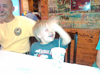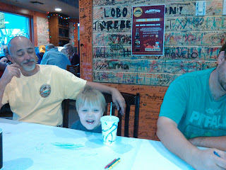 | Ben! We found out he liked hush puppies and restaurants where you can color on the table. |