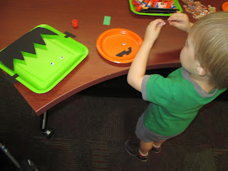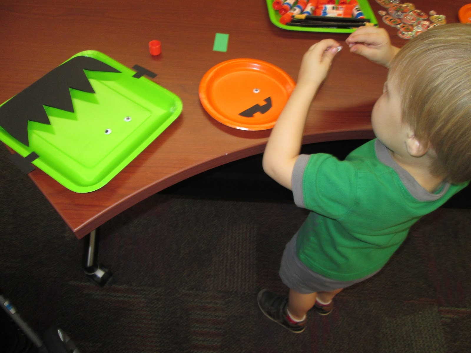 We started off by attending several library programs. The nice thing about our new library system is that we have more branches we can go to. We went to two Halloween story hours. We also did a craft party. Ben loved the little crafts! They were perfect for his age. There were three different plates we made into a Frankenstein monster, a jack-o-lantern, and a bat. The pieces we needed were already cut out, we just had to glue them on. It took just the right amount of time for Ben’s attention span.