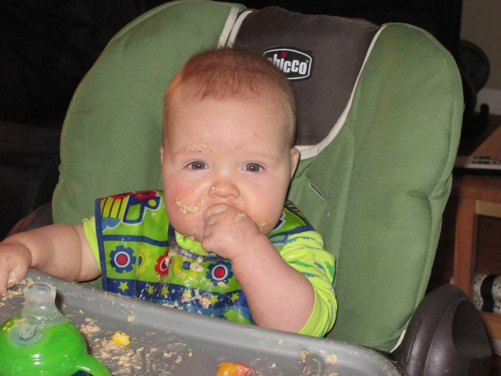 I’m glad we have an aresonal of ‘clean’ foods for Ben to eat. This comes in handy when we are out in public or just don’t have time to do a major cleaning. He still hasn’t needed a full on bath due to food consumption. But I am loving my messy baby when he eats his oatmeal. I am happy he is trying new foods. I think we will find so much more he enjoys if he is willing to get a little messy. And I am loving the messy baby pictures. I’ll have to save these for when he is all grown up.