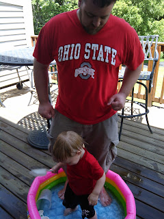Meo and Omi found a little pool for Ben to play in! I think it’s a good way to get us to bring Ben over to their place more. 😉 We tried it out for the first time on Father’s Day. Ben adored it!! He loved that he could get in and out on his own, and that is was just his size. He could sit in it, and practice putting his face in. We all sat on the deck with Ben playing in his pool, happy as can be. Plus, since the pool is so small it is easy to fill and empty. I think it’s going to be a summer staple and Meo and Omi’s.