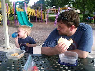 That evening we did go out to a park to have a picnic! Ben and I have decided that this summer we are going to try to go to every playground in the park district area. Okay, I decided that. But Ben isn’t arguing. That is 24 playgrounds to visit! We need to go to more than one a week most weeks! We’ve already been to four, only twenty more to go! I like having a challenge for the summer, especially one that gets us out of the house and playing!