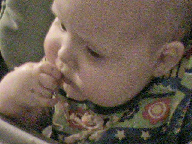 Oh my, is he a happy boy!! He loves to eat! We have also jumped into additional foods. The plan was to stick to the traditional time line for introducing foods. This meant we would start with fruit and vegetables, and slowly add meat as he got older. Then one day he lunged for my turkey sandwich. I have him a little bite, and he loved it! I don’t want to give him a lot of lunch meat, it has a lot of salt and nitrates in it. But he has now had chicken and pork. He really likes it! Since he liked that we have given him eggs too! Just the yolks for now, as I read the allergen part is in the albumin in the whites. He has had oatmeal and rice. We have given him a couple of tastes of white potato made in the slow cooker, but otherwise he has just had sweet potatoes. We are going to hold off on all the big allergen foods for right now, and the foods that have known reasons to withhold. So no peanut butter, honey, citrus, shellfish, or milk just to drink right now. We are holding off on dairy a little longer as well, but he has things cooked with milk.