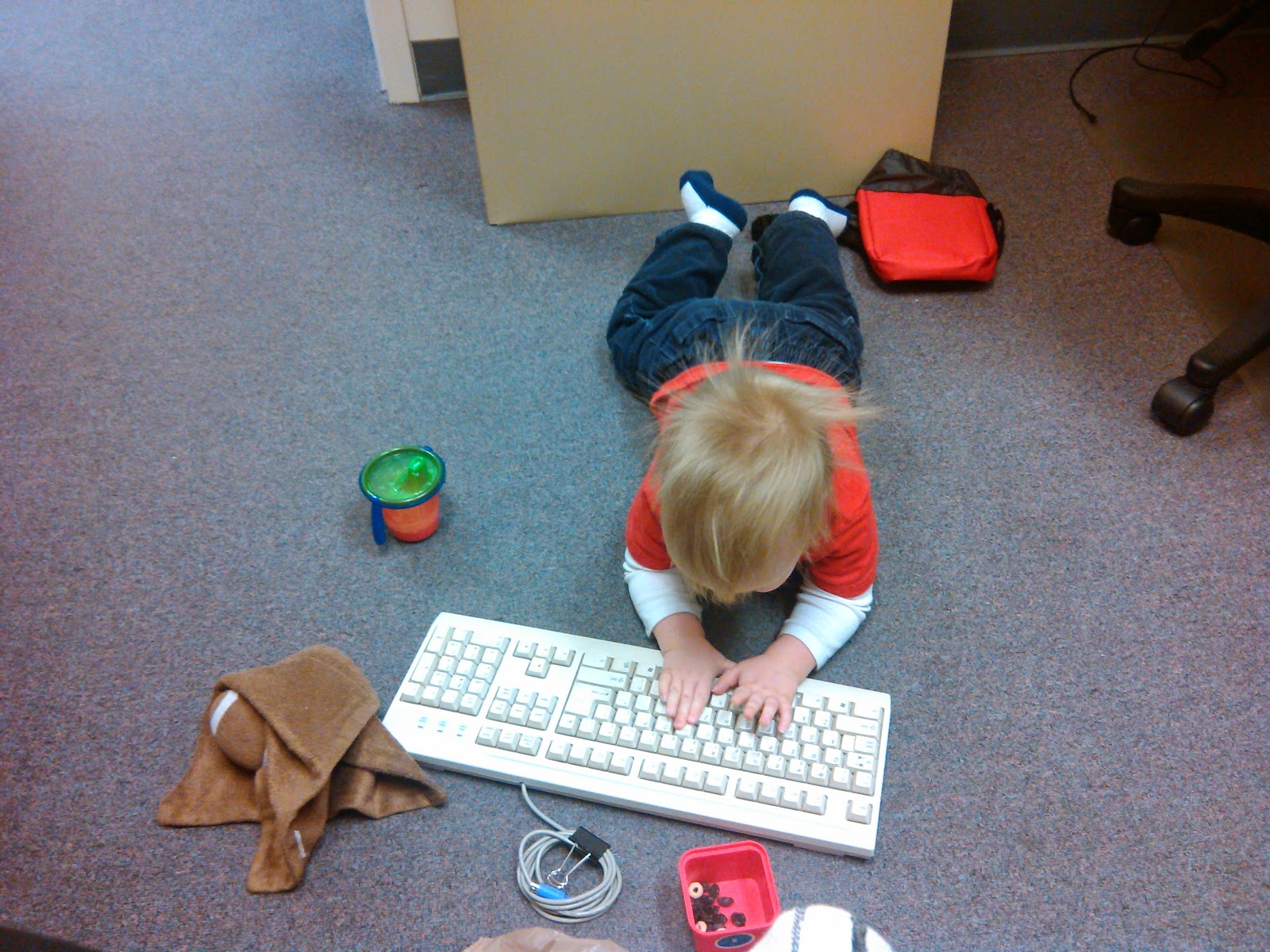 Meo got a new computer at the office yesterday, so she no longer needed her old keyboard. We unplugged it and gave it to Ben. He can’t get enough of it. He carries it around the office and sits to type on it. This morning he brought it into the room I was in, then ran and got his milk and snacks to ‘work.’ I wonder where he got that from? (As I sit here with my water and pretzels, typing away. 😉 )