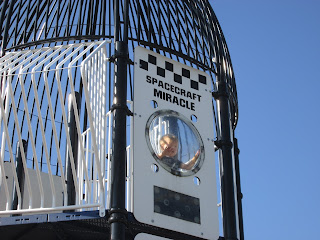 Part of the rocket can be reached by stairs, and Ben had no problem climbing up those. The upper level had more of a ladder to get up. I was happy the girls were pretty content in their stroller and that no one else was at the park, as I was able to help Ben up the ladder to reach the very top! He really enjoyed running around up there and looking out the window. He ran around giggling for quite some time!