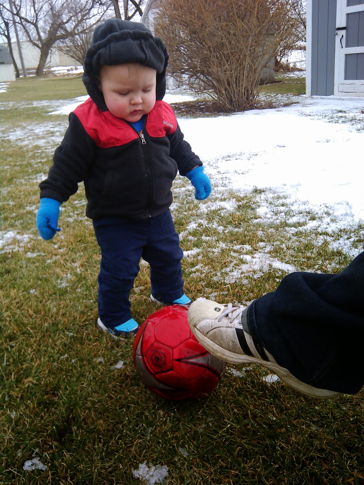 As you can probably tell from the small amount of snow, these pictures are from before our big snow day last week. The day before the blizzard we played outside with Ben for a bit. We brought out the soccer ball and attempted to kick it around a little. Ben liked chasing it down, but when the ball is up to your knees it is hard to kick it around. We had some fun running around the back yard.