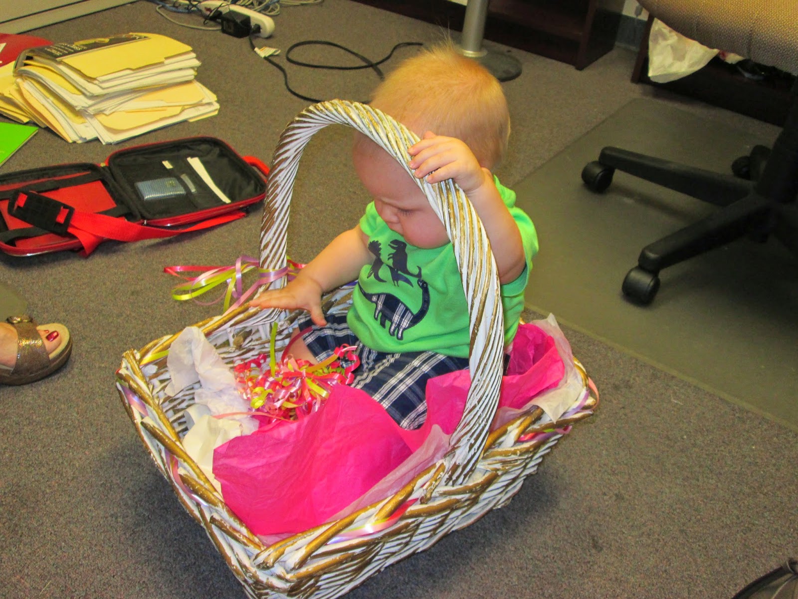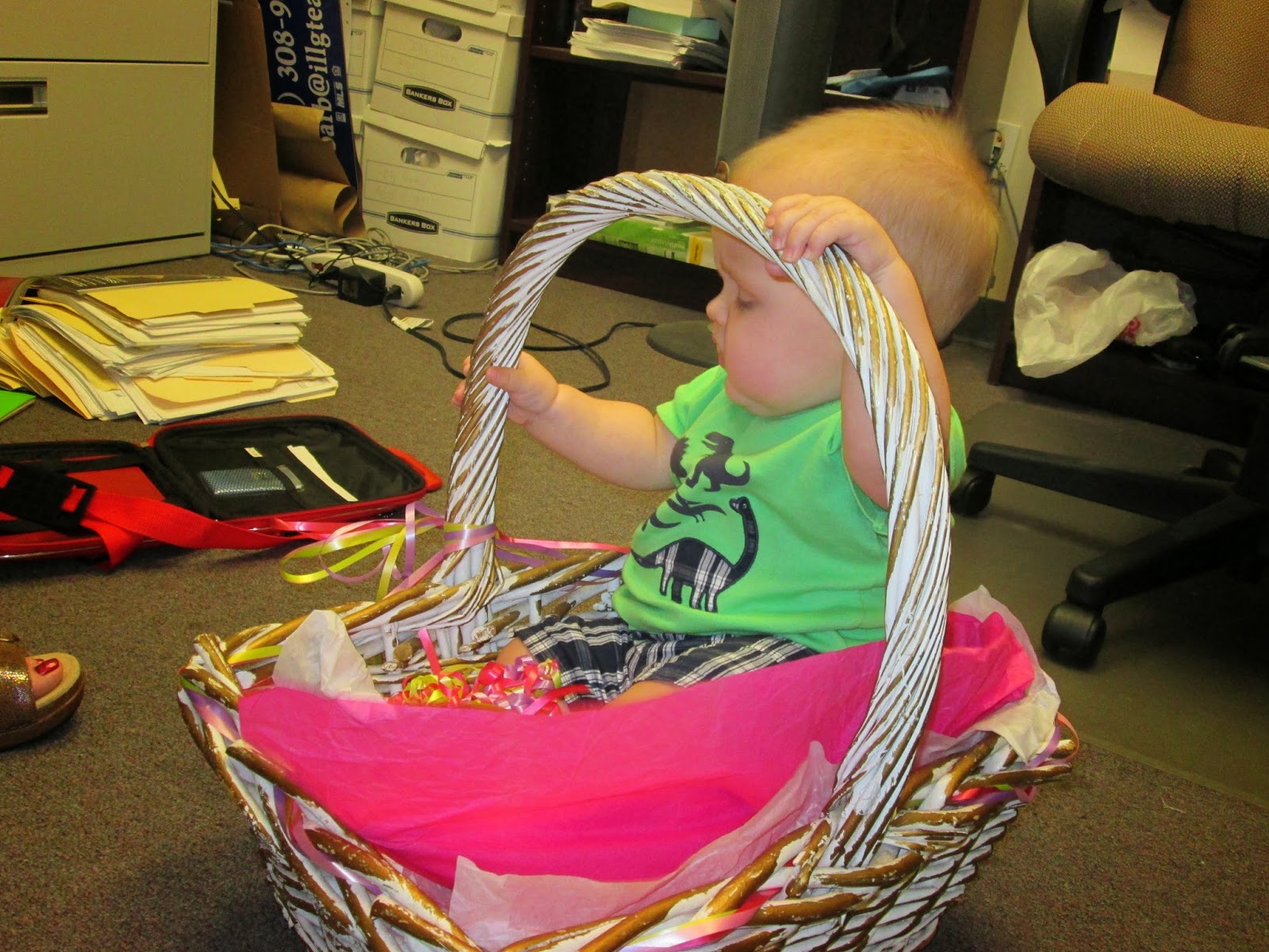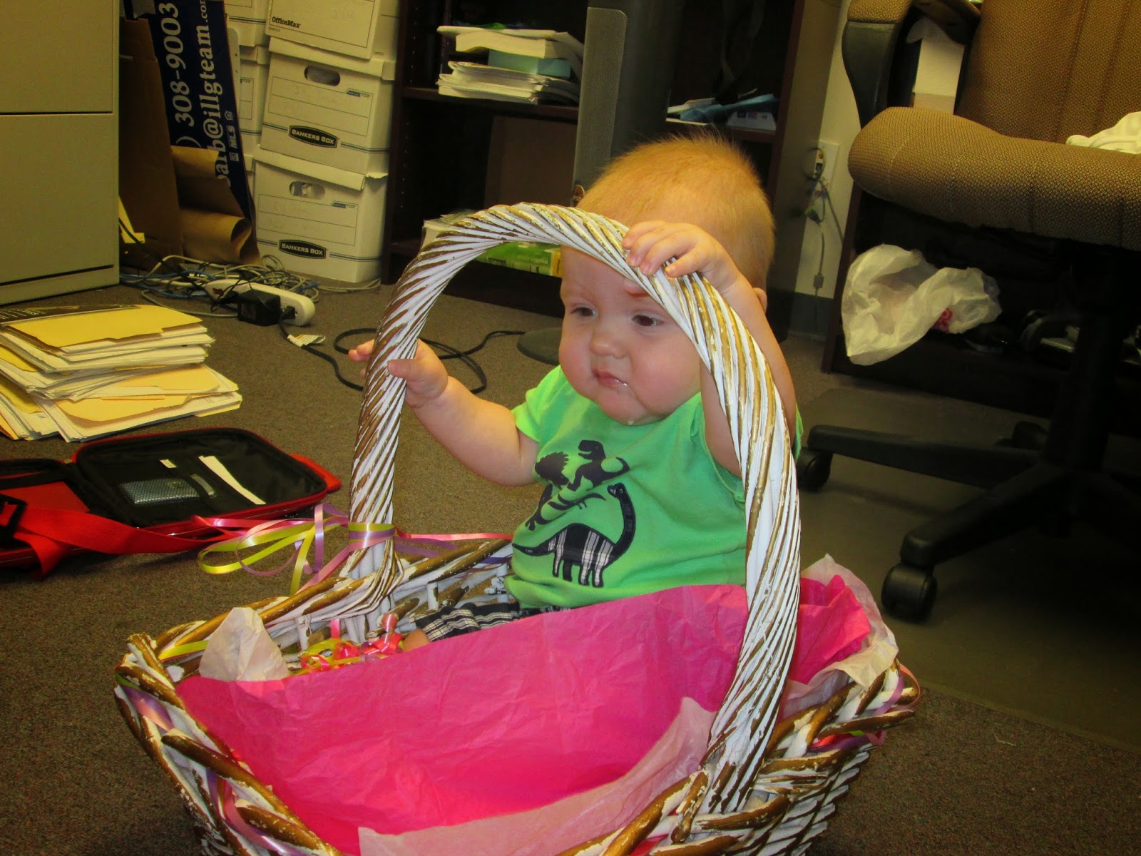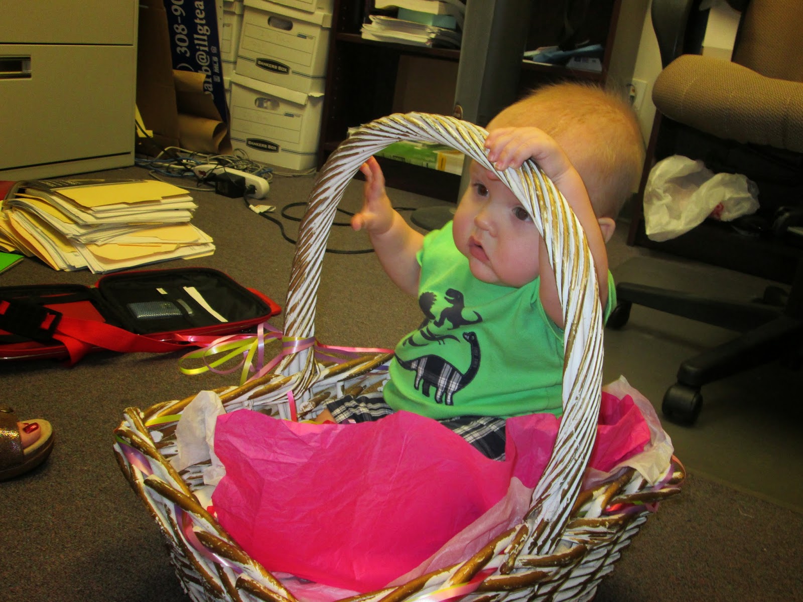 Here is an example of our fun. We had a baby in the office. We had a big basket in the office. Is anyone surprised by what happened?