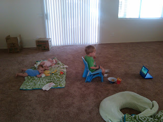 I tried to have some fun with the kids in all the craziness. Ben loves the new house. He really enjoyed running around when nothing was moved in yet! The girls have gotten so busy too! They aren’t officially crawling yet, thank goodness. But they wiggle and roll and manage to get all over the place! It doesn’t seem to be directed motion yet. Ben didn’t crawl until he was almost a year old and it was wonderful. It is so much easier to keep the kids safe when they stay where you put them! Plus once Ben did start crawling he was older and better able to understand limits and the word no. I admit I’m a little concerned with how much the girls are able to wiggle around this young. Two of them getting around on their own?! I’m not ready! It is fun to watch them play at least. 🙂