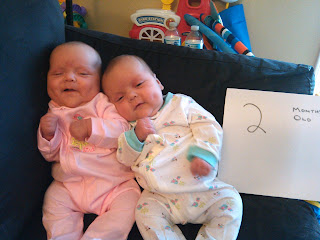 This month Ali and Sam are even more fun than they have been. They have more times in which they are awake and alert. They love to look at us and are smiling. They also love to watch their big brother run around. He isn’t yet aware of how much they love to watch him. I know when he realizes he has a captive audience he will be thrilled. The girls are still eating well, which I love. I am able to nurse them at the same time for all their day time feedings, which is awesome. It saves so much time to be able to nurse them at the same time. Their sleep is improving. Sure, some nights are still more challenging than others. But they are improving. The major challenge is usually getting Ali asleep initially. After that things aren’t too bad. Sammy needs a little more help at nap times, so they each have their strengths. I really can’t complain though. Sure, we are tired some days. But for twins I think we are doing very well in the sleep department.