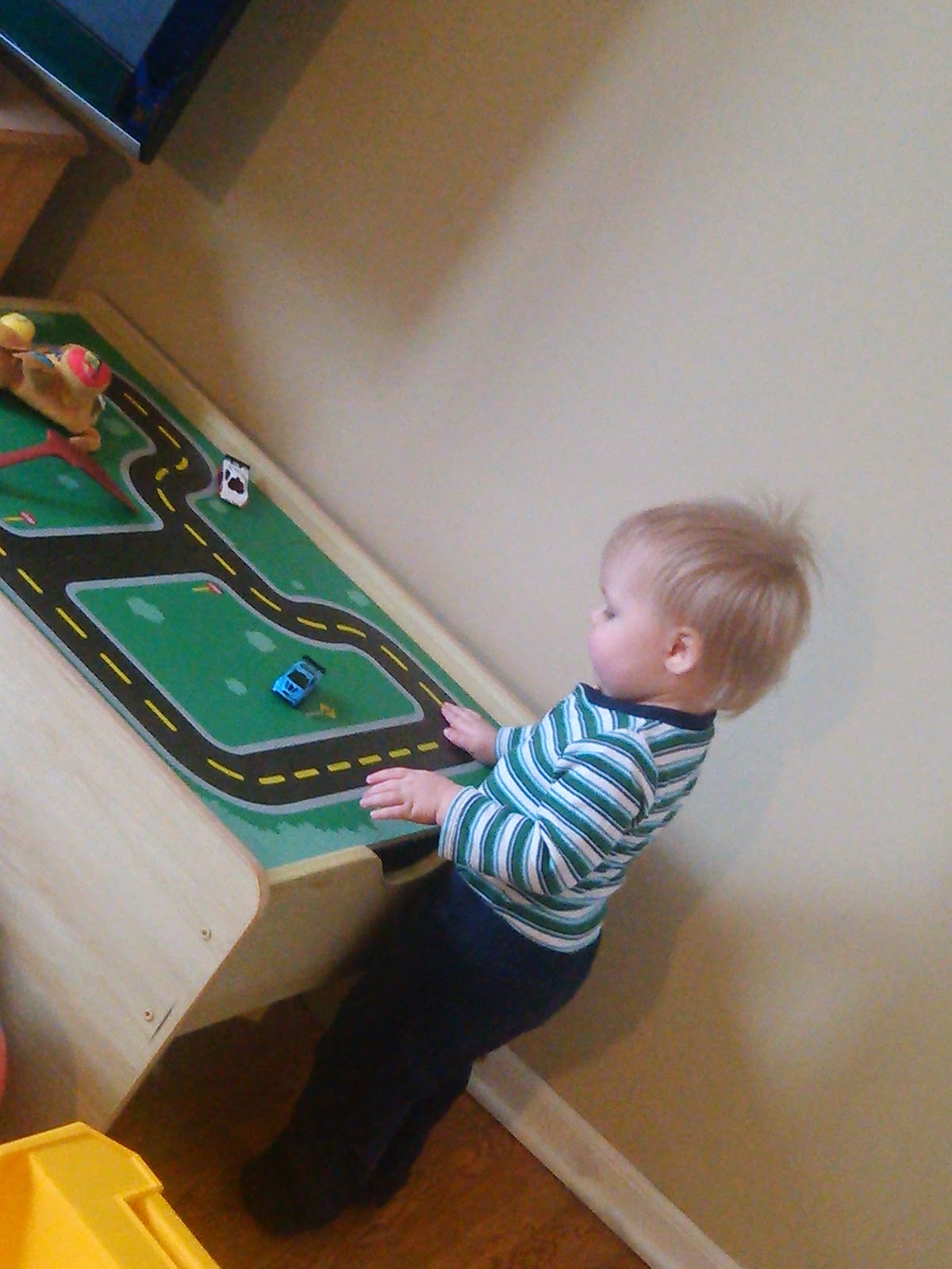 Well, I shouldn’t have been worried, because it went well! I think it helped that we aren’t often home in the middle of the week, so it was different for Ben. We got up and got ready just as it was a normal day, except instead of heading to the office we stayed home. Ben ‘worked’ along with me. He was pretty well behaved too! Oh, there were a couple of time outs, but really, he’s 18 months old. Things are going to happen. Overall, he did really well! We even got to spend a few minutes outside. The plumbers came, I cleaned the bathrooms, did some laundry, and managed to get all the work I brought home done. Oh, and kept the kid alive.